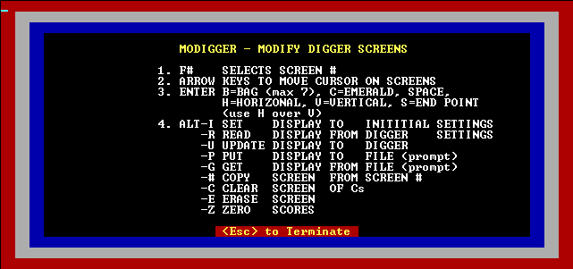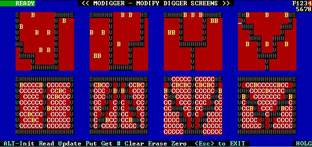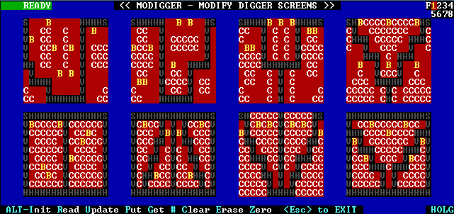 yealds:Now ALT-U and the digger.com is updated. Now when the game is played Screens 1-4 are skipped! (just get to the good stuff, in the old days this took about 15 min on 8088!) Eliminate all screens but one to practice! New screens may be created!